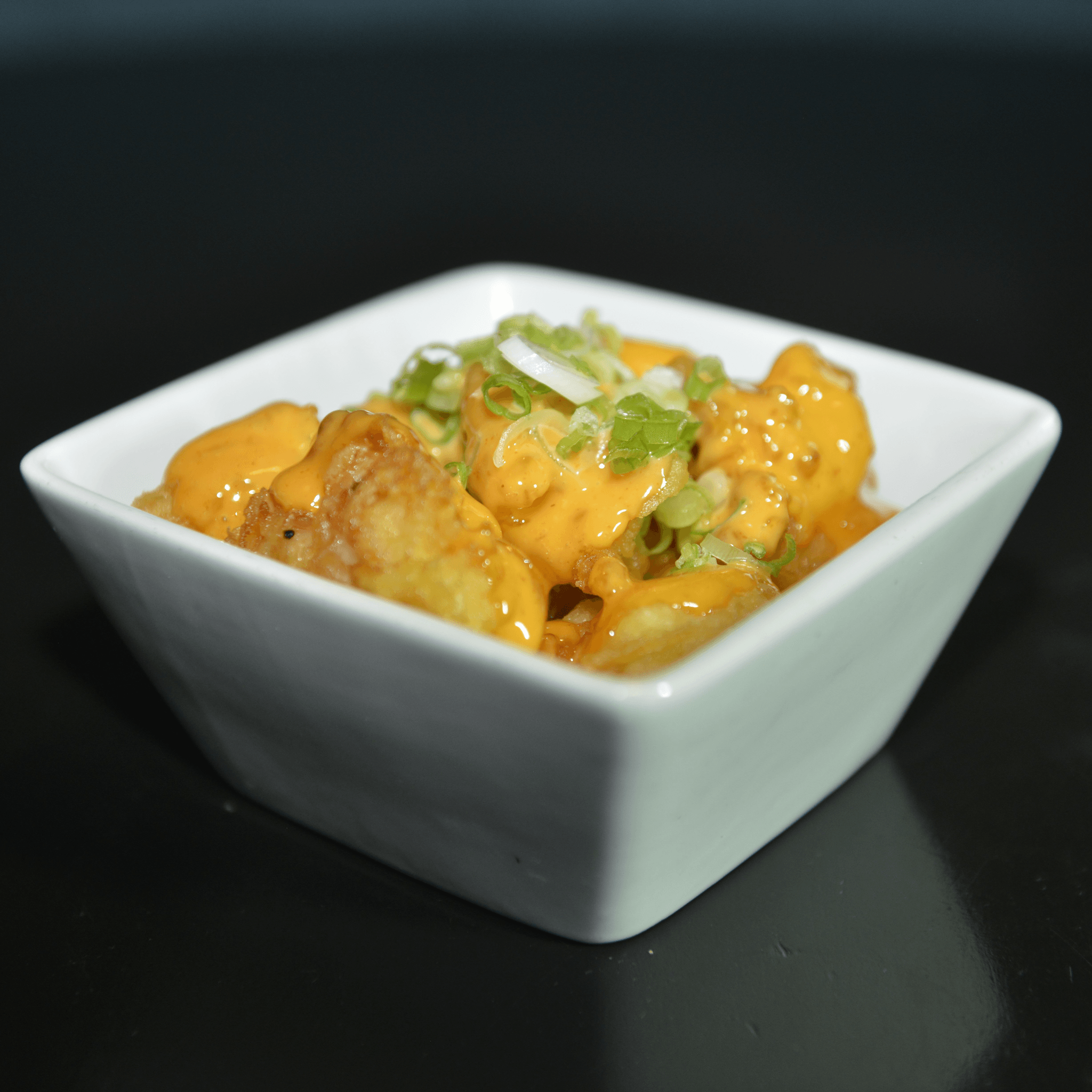 Tender bite-sized rock shrimp, lightly battered and flash-fried until crisp, tossed in a creamy, spicy sauce with a touch of sweetness.