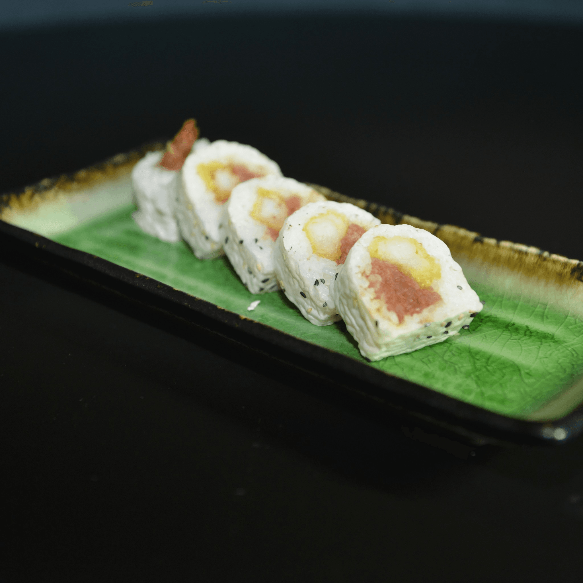 Spicy tuna and shrimp tempura rolled with sushi rice and seaweed.