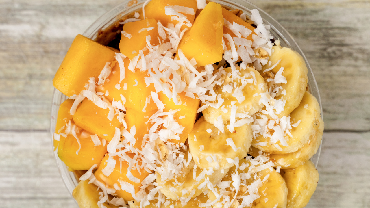 ACAI BASE MANGO BANANAS HONEY GRANOLA FRESH PEANUT BUTTER COCONUT FLAKES