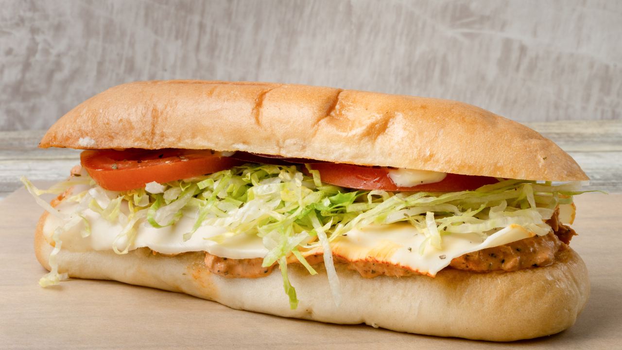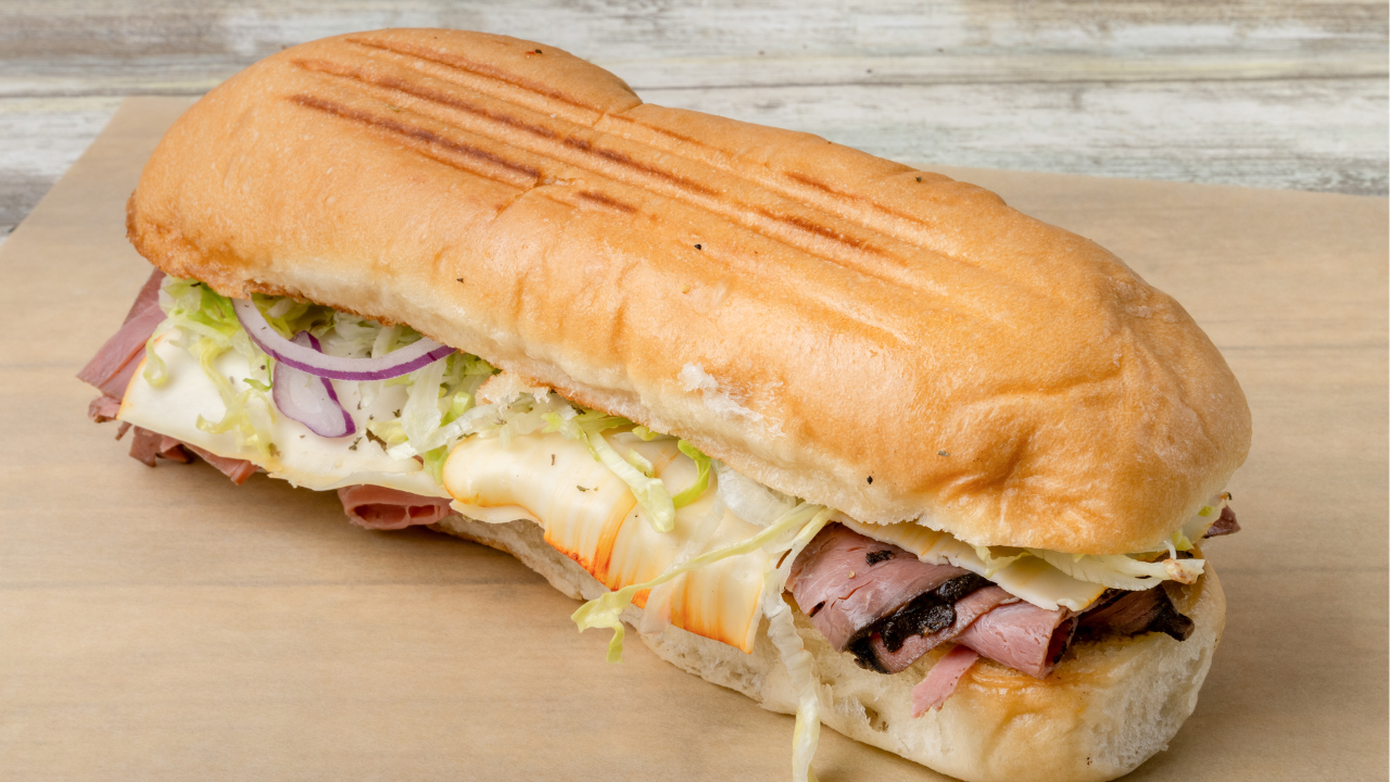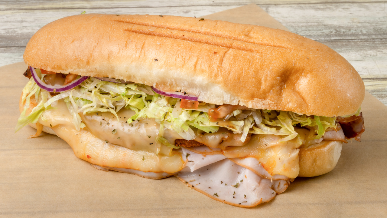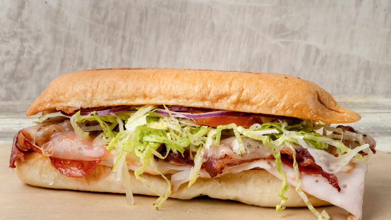 Lettuce, Tomato, Onion, Munster, and Pastrami with Mayo and mustard.