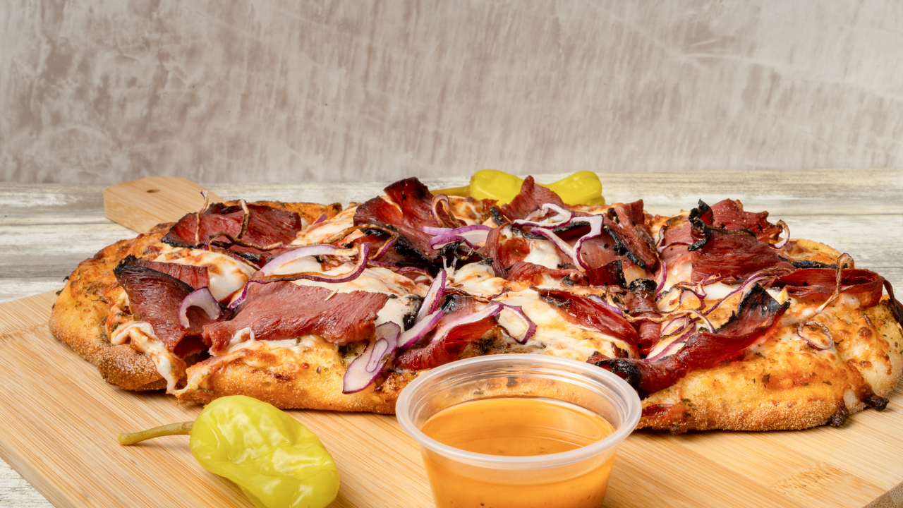 Beef pepperoni, beef bacon, jalapeños, and hot honey