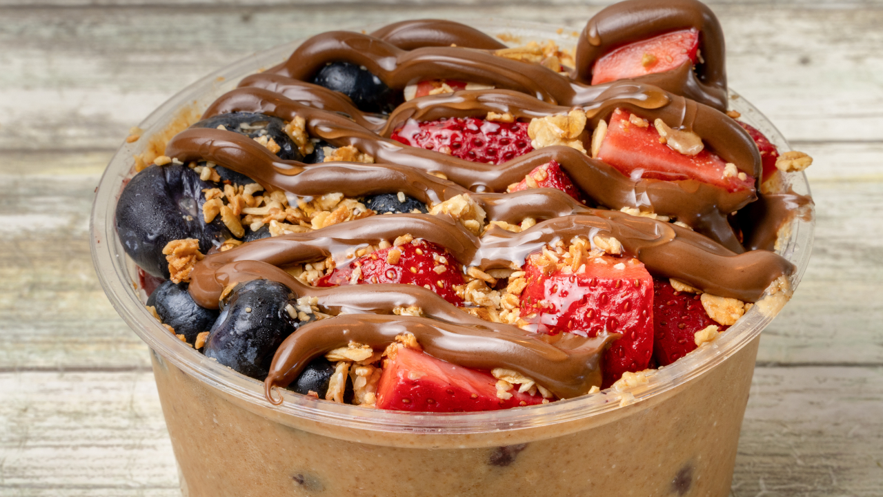ACAI BASE BANANAS STRAWBERRIES BLUE BERRIES CHOCOLATE NIBS GRANOLA FRESH PEANUT BUTTER