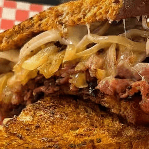 Thinly sliced grilled pastrami, shredded cheese, sliced pickles, grilled onions and drizzled with horseradish