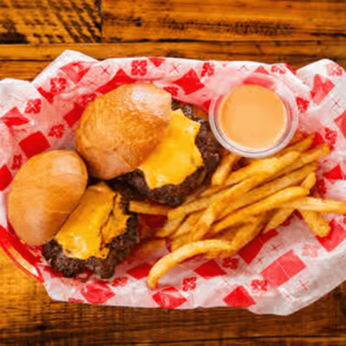 Two steakburger patties, Matty G's fry sauce, applewood smoked bacon, American cheese, grilled onions, lettuce, and tomato