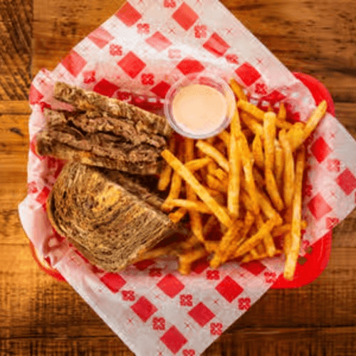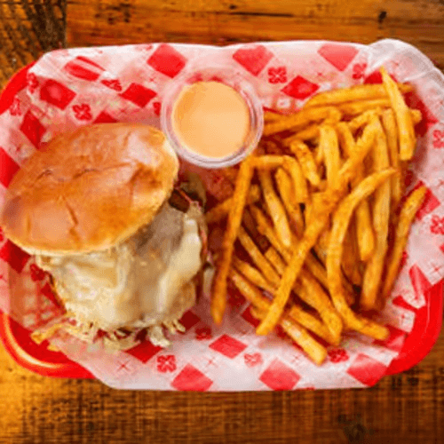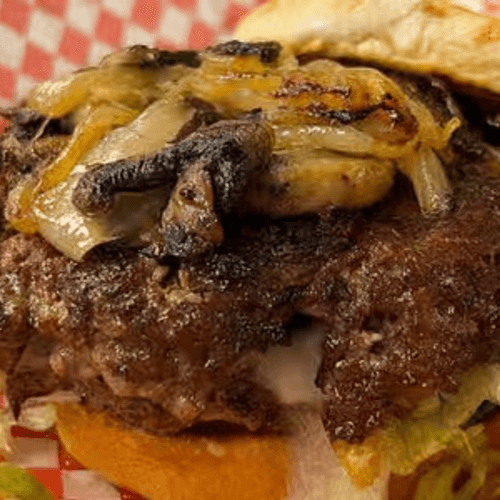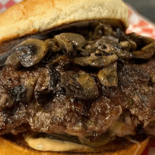 Two steakburger patties, Pepper Jack cheese, sauteed mushrooms, grilled onions, and Matty G's fry sauce on marble rye bread