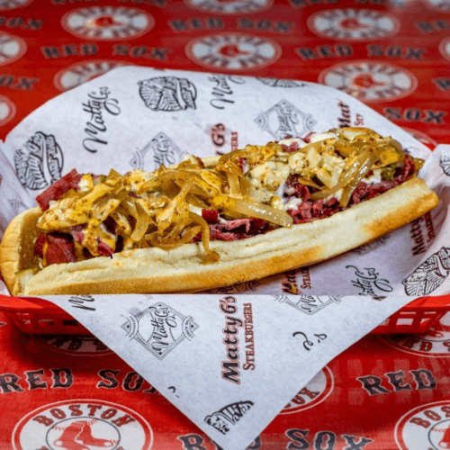 Grilled pastrami, Swiss cheese, grilled onions, Matty G's fry sauce, and pickles on marble rye bread