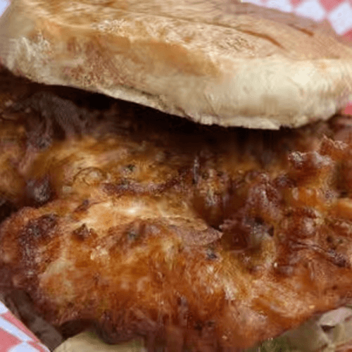 One steakburger patty or grilled chicken breast, grilled ham, grilled pineapple rings, Swiss cheese, and sweet & spicy sauce