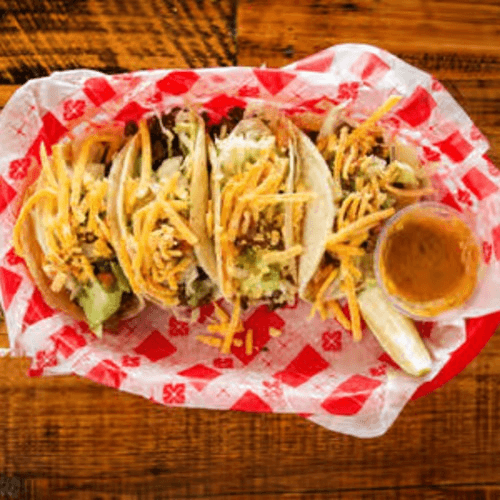Grilled carne asada or chicken, lettuce, pico de gallo, and shredded cheddar cheese served with homemade salsa on corn tortillas (no mix and match)