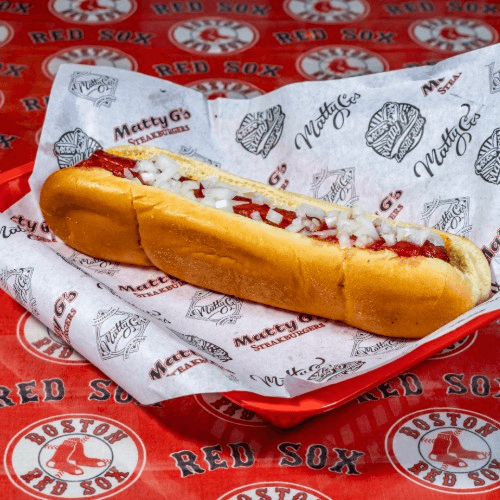 All beef footlong hot dog, ketchup, mustard aioli, and diced onions