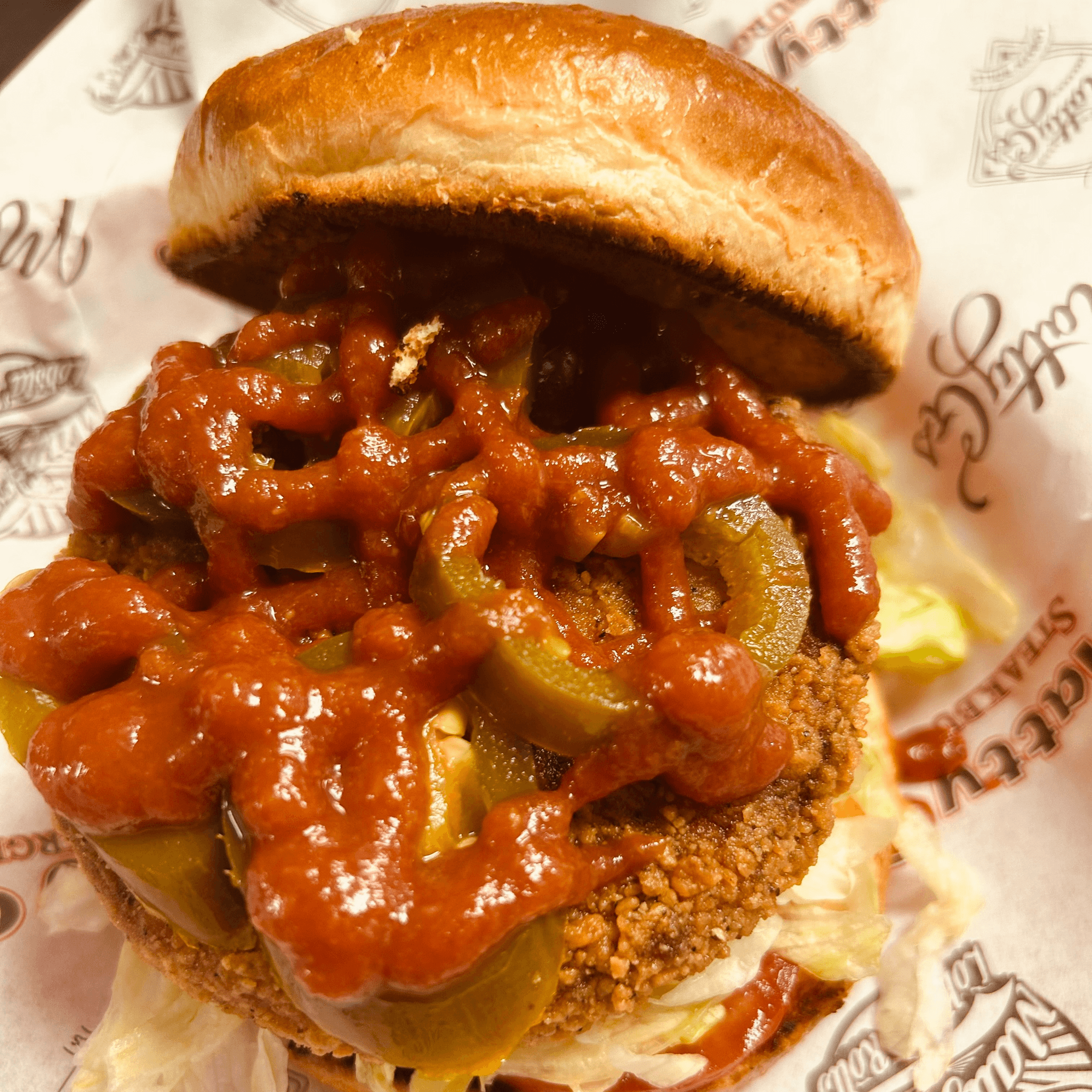 Fried shrimp patty, tomato, lettuce, pickled jalapeño, cocktail sauce