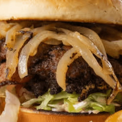 Two steakburger patties, BBQ sauce, applewood smoked bacon, American cheese, onion rings, and pickles