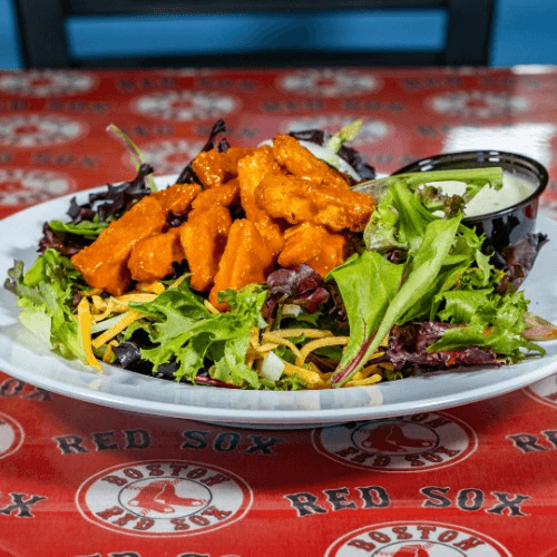 Spring mix, fried chicken tossed in buffalo sauce, shredded cheddar cheese, onions, and ranch dressing