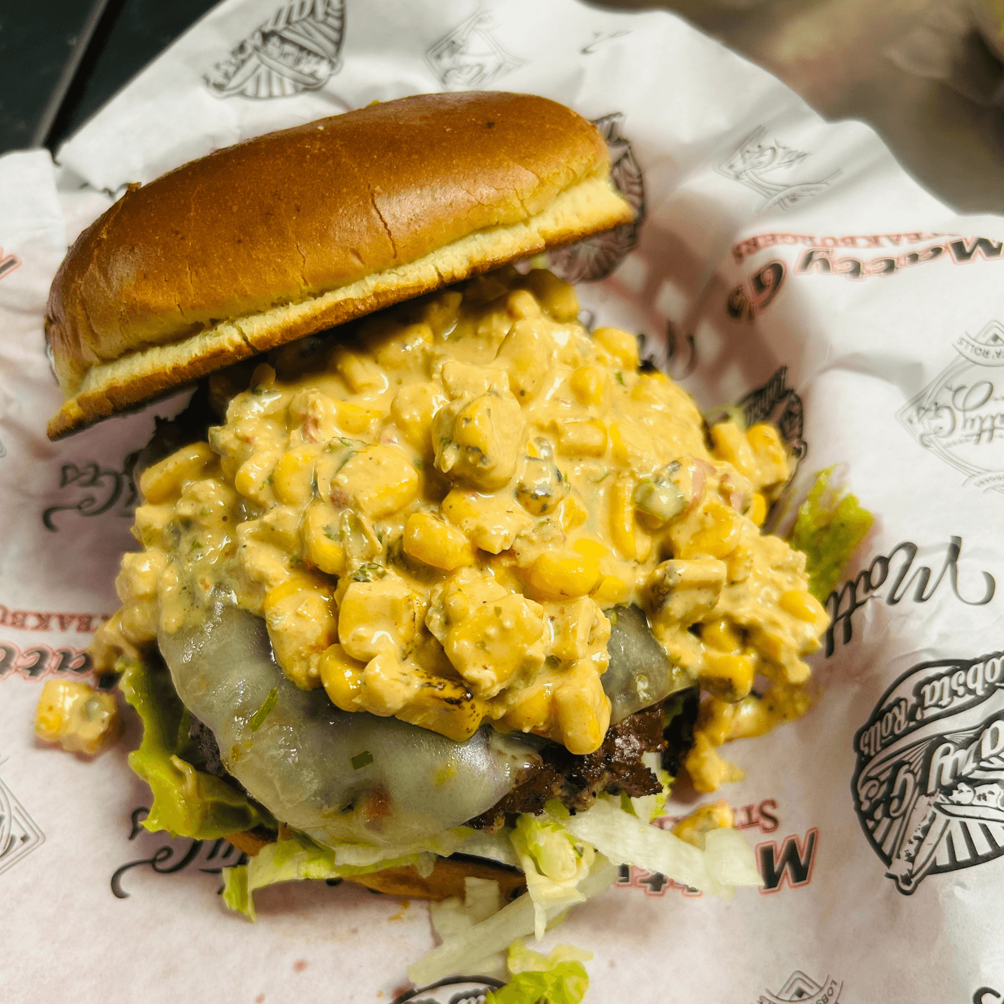 One steakburger patty, street corn, pepperjack cheese, avocado spread, tomato and lettuce