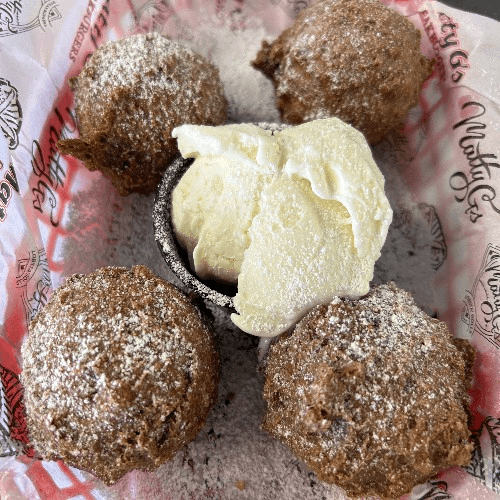 Four deep-fried chocolate chip cookie dough balls topped with powdered sugar and served with vanilla ice cream