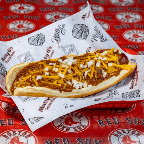 All beef footlong hot dog, diced onions, chili, and shredded cheddar or nacho cheese sauce