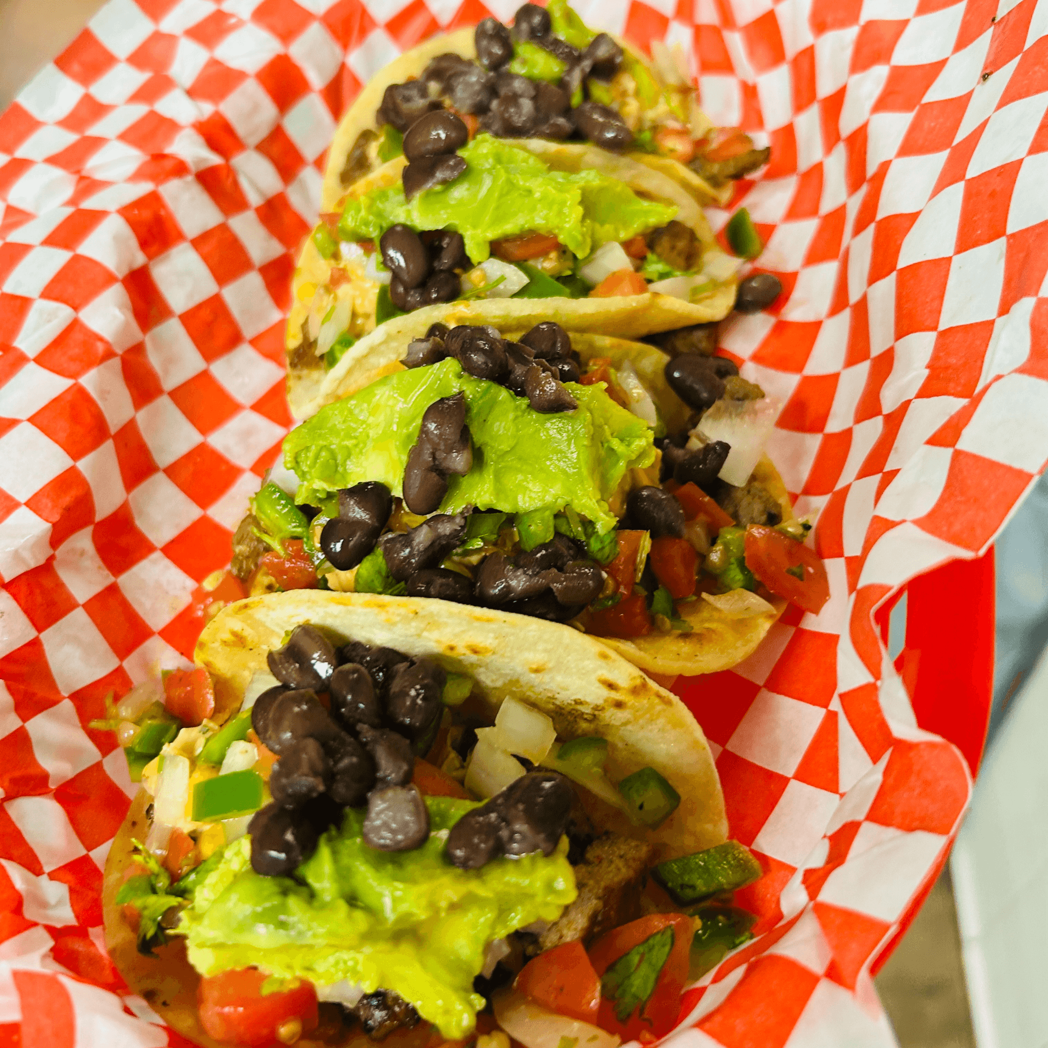 Grilled carne asada or chicken, avocado spread, street corn, pico de gallo and black beans on corn tortillas