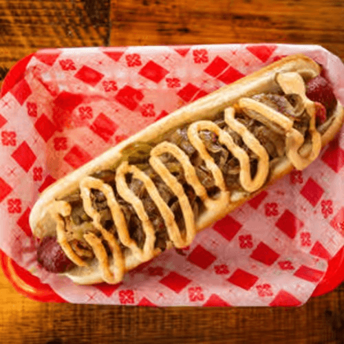 All beef footlong hot dog, wrapped in applewood smoked bacon, grilled onions, pickled jalapeños, and chipotle aioli