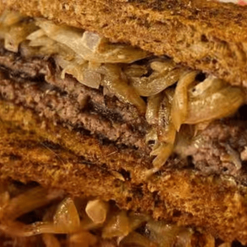 Two steakburger patties, Swiss cheese, grilled onions, and Matty G's fry sauce on marble rye bread