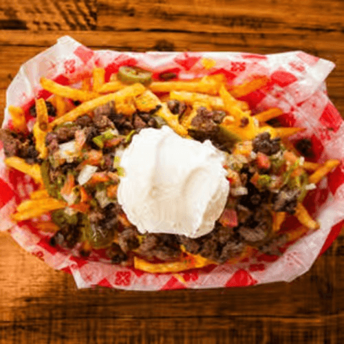 Thinly sliced carne asada, shredded cheese or nacho cheese, sour cream, pico de gallo, and pickled jalapeños