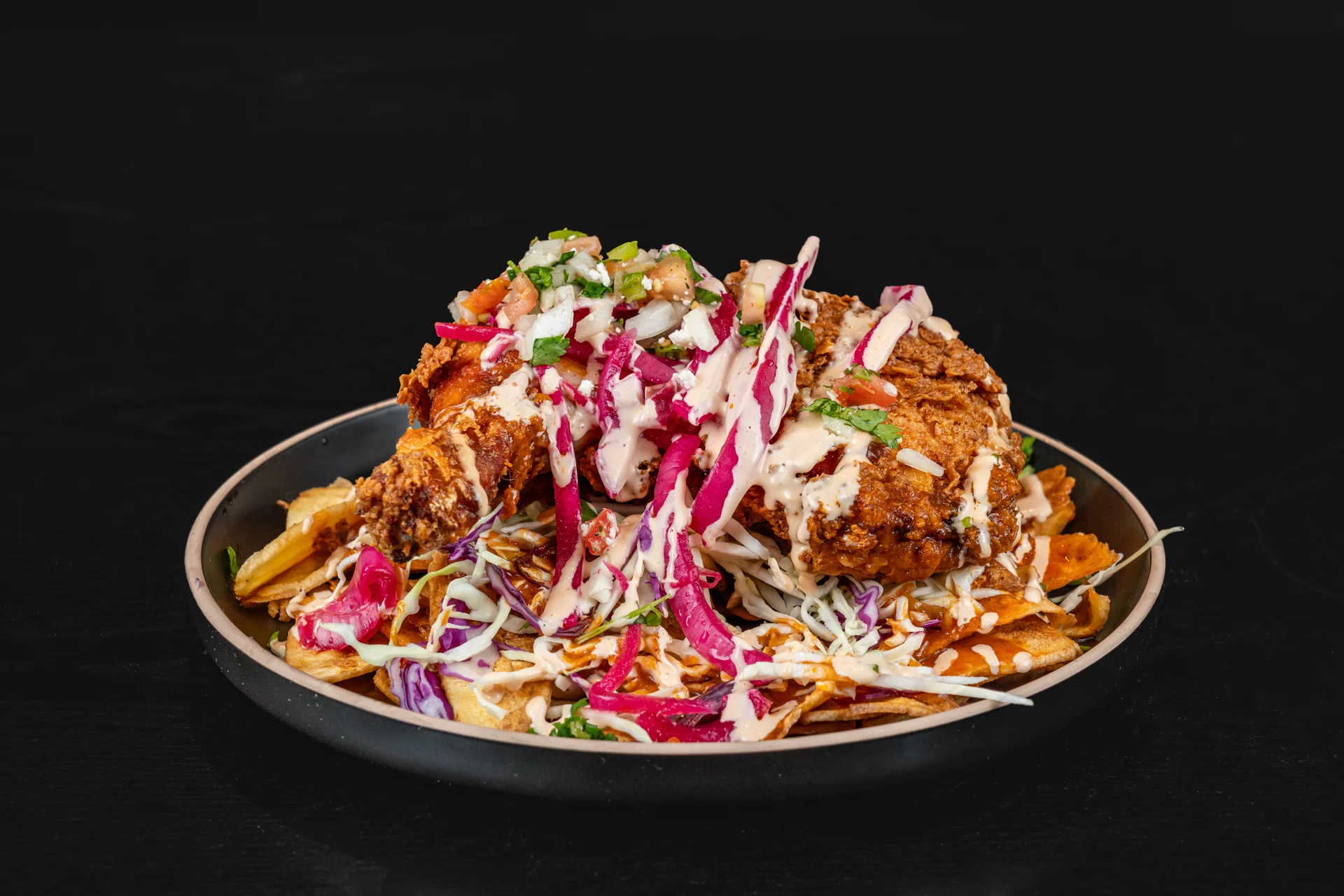 Your choice of fry chicken drumstick or breast, served on a base of fry bananas, cabbage salad and pickles onion, with our house sauces .