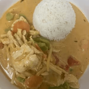 Panang curry paste, coconut milk, peanuts, bamboo shoots, carrot, bell pepper. Served with jasmine rice or brown rice