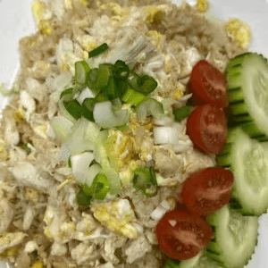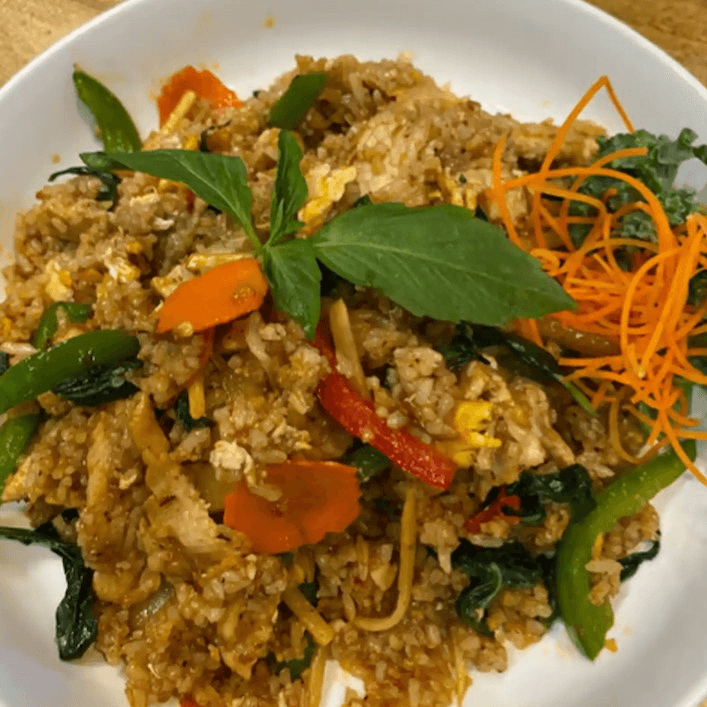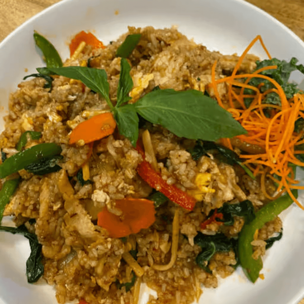 Stir fried rice, egg, fresh garlic, chili, onions, carrot, bell pepper, bamboo, fresh basil. Available Monday to Saturday from 11:00 AM to 3:00 PM.