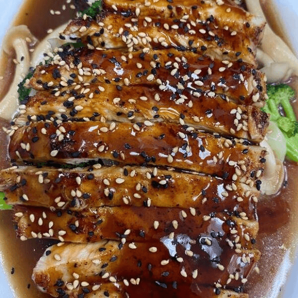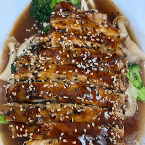 Grilled chicken on a bed of broccoli with teriyaki sauce. Served with miso soup or ginger salad and jasmine rice