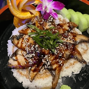 BBQ eel, on top of sushi rice with sesame seeds and eel sauce. Served with clear soup, miso soup, or ginger salad