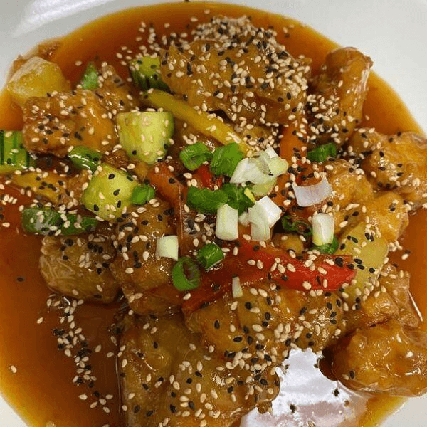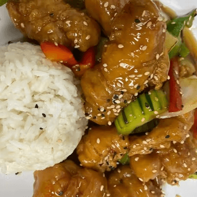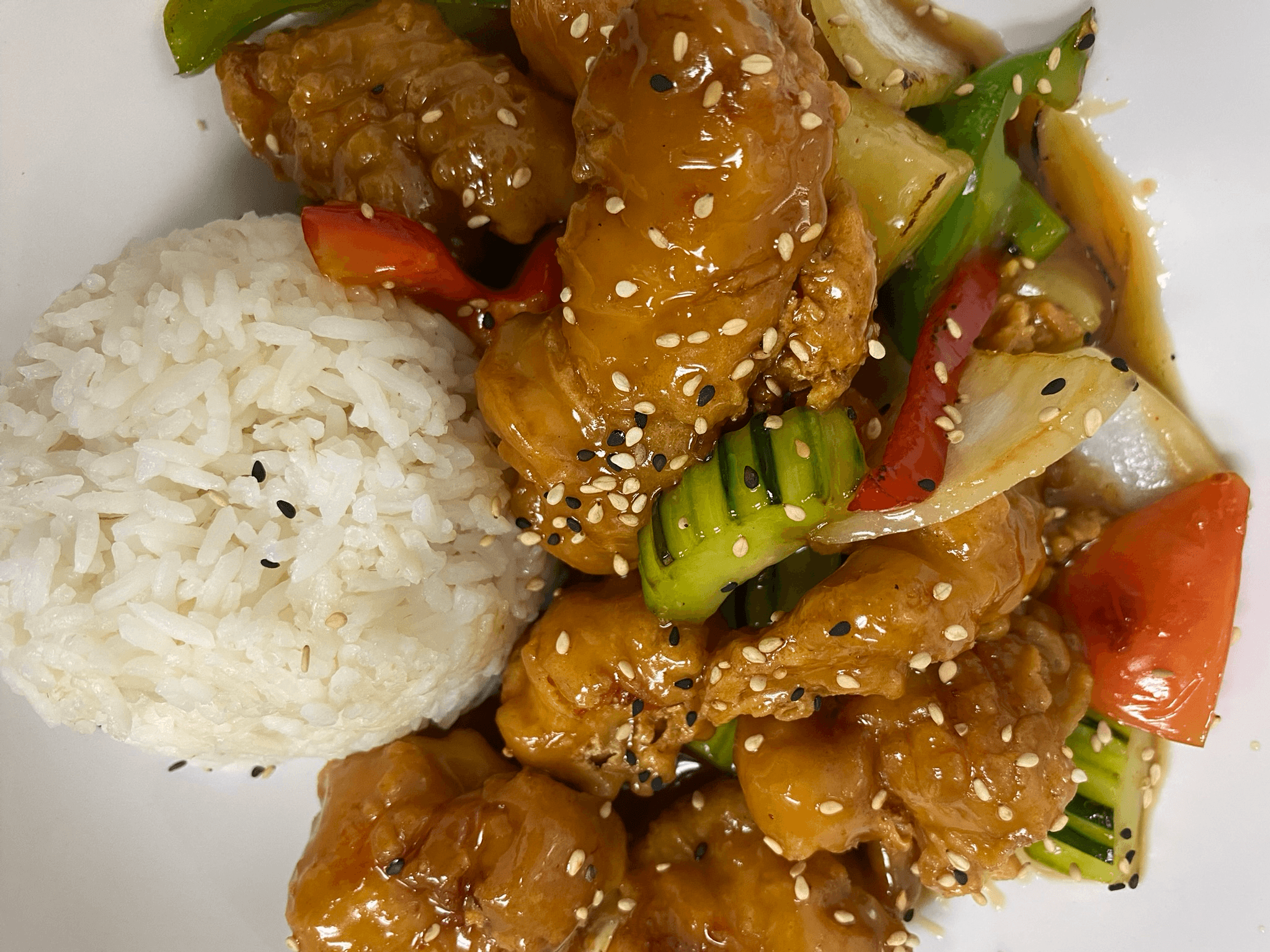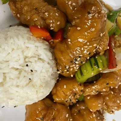 Crispy chicken breaded, bell peppers, pineapple, scallions, sesame seeds, with orange sauce. Available Monday to Saturday from 11:00 AM to 3:00 PM.