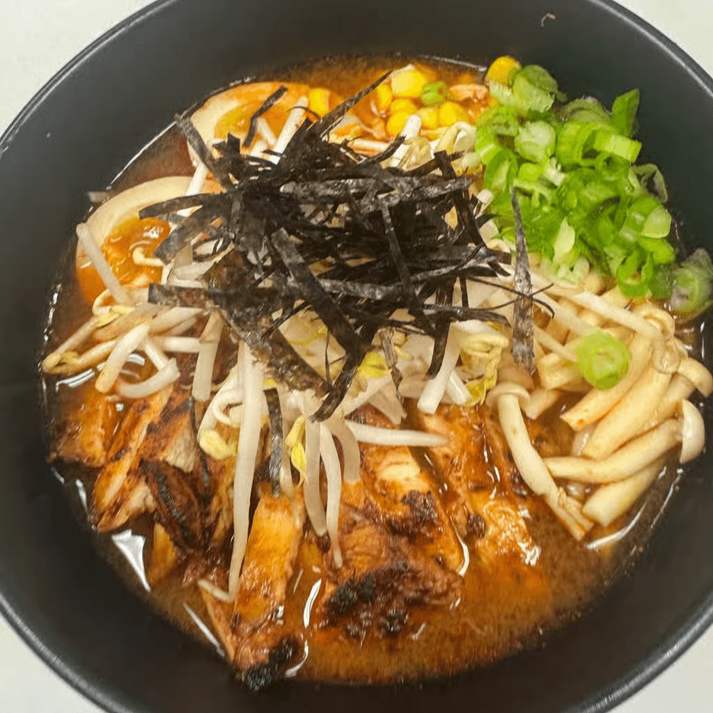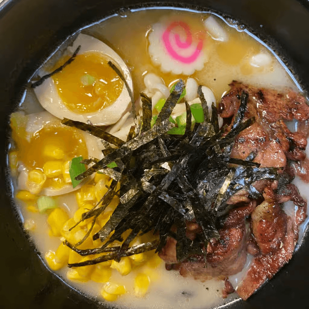 Egg noodles, mushroom, bean sprouts, dry seaweed, scallions, seasoned egg, fish cake, sweet corn in a spicy miso soy broth