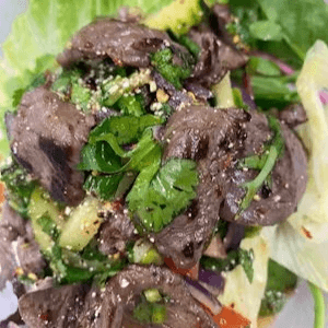 Grilled beef mixed with lime juice, onion, and fresh Thai spices on a bed of lettuce. 🔥 Spicy