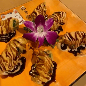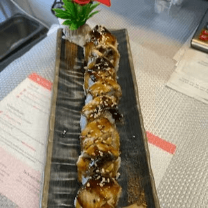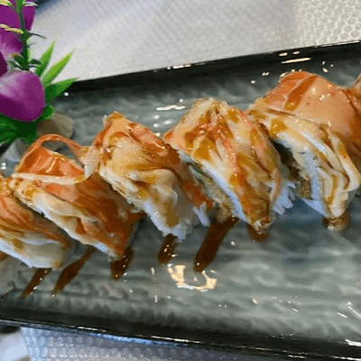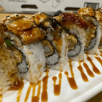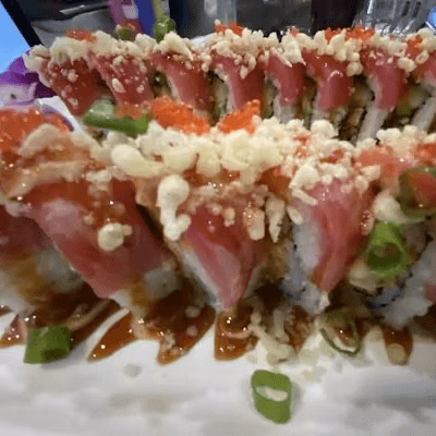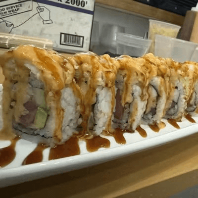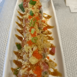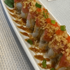 Served raw. Shrimp tempura, asparagus, eel, imitation krab, avocado, topped with tuna, tempura flakes and spicy sauce, eel sauce, spicy mayo. 🔥 Spicy / 🐟 Served raw