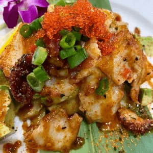 Served raw. Spicy crab meat, cucumber, avocado, cilantro, jalapeno topped with tuna, spicy house sauce, tempura flake. 🔥 Spicy / 🐟 Served raw