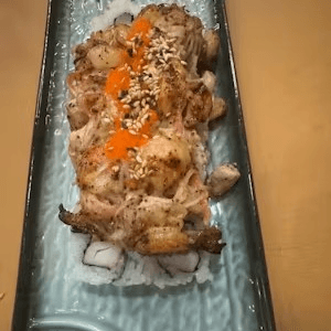 Chicken tempura, asparagus, avocado, sesame seeds with eel sauce & spicy mayo. 🔥 Spicy