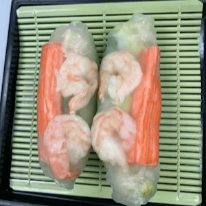 2 rolls. Steamed rice paper stuffed with shrimp, imitation krab, fresh lettuce, carrot, cucumber, basil leaves, and rice noodles, served with homemade peanut sauce
