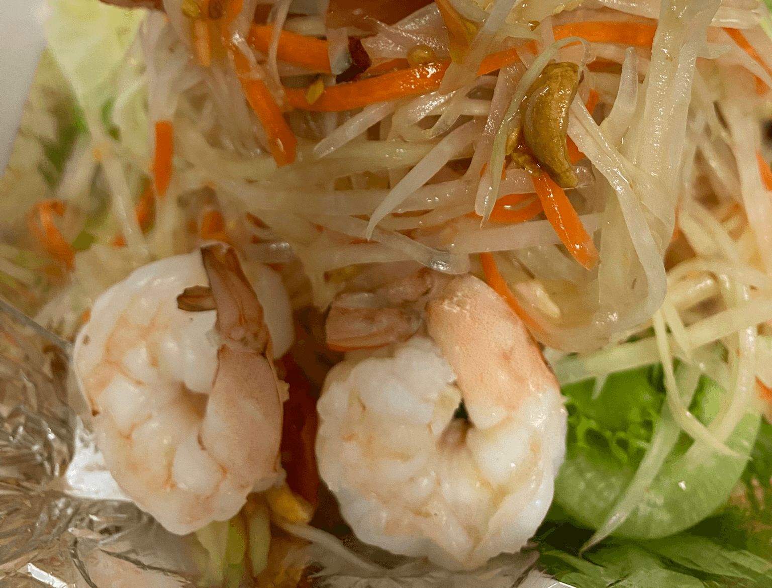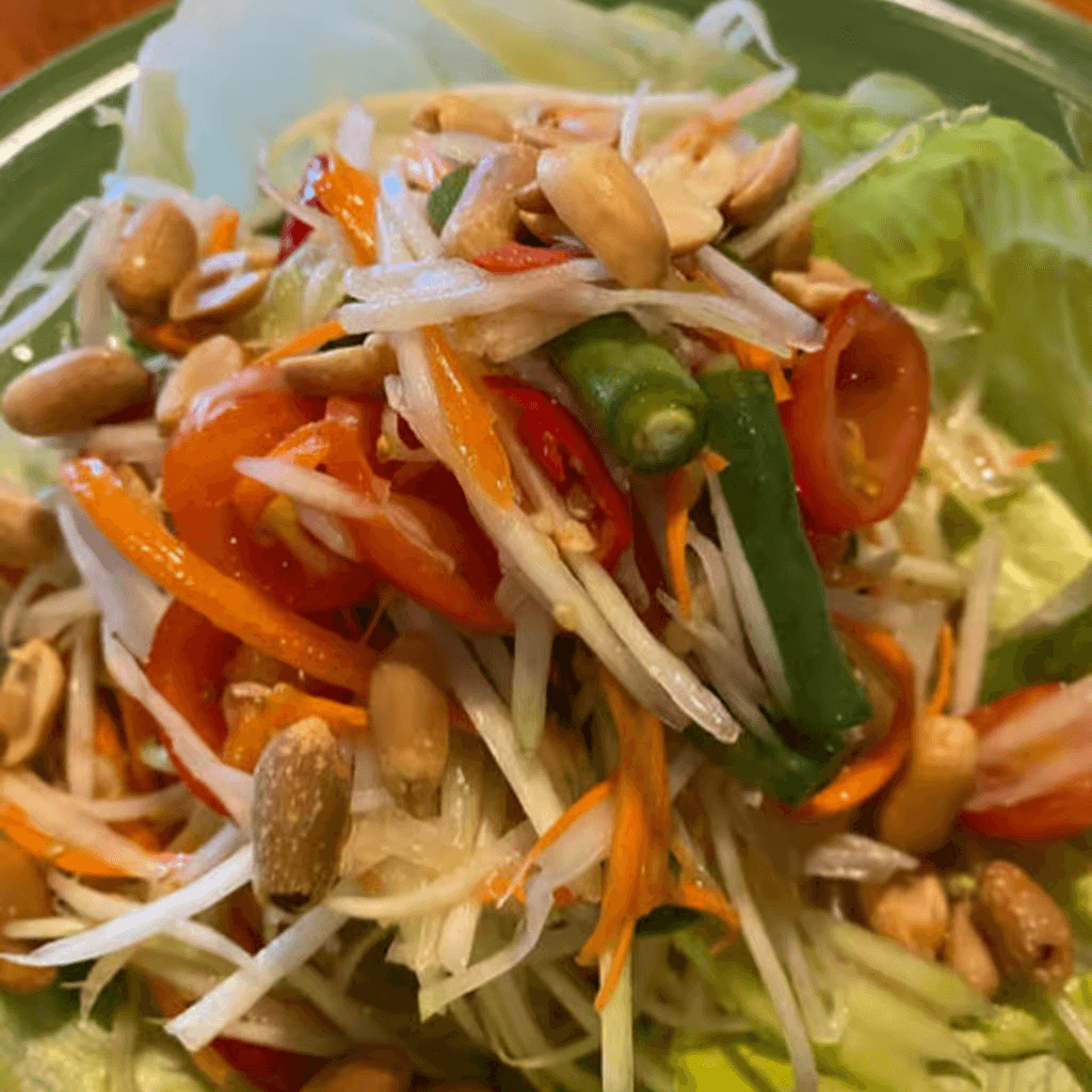 Shredded green papaya, carrots with fresh garlic, chili, tomatoes, green beans, fish sauce & lime juice. 🔥 Spicy