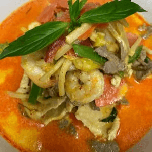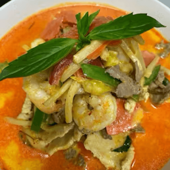Red curry paste, coconut milk, bamboo, bell peppers, eggplant, kaffir lime leaves and fresh basil leaves. Available Monday to Saturday from 11:00 AM to 3:00 PM.