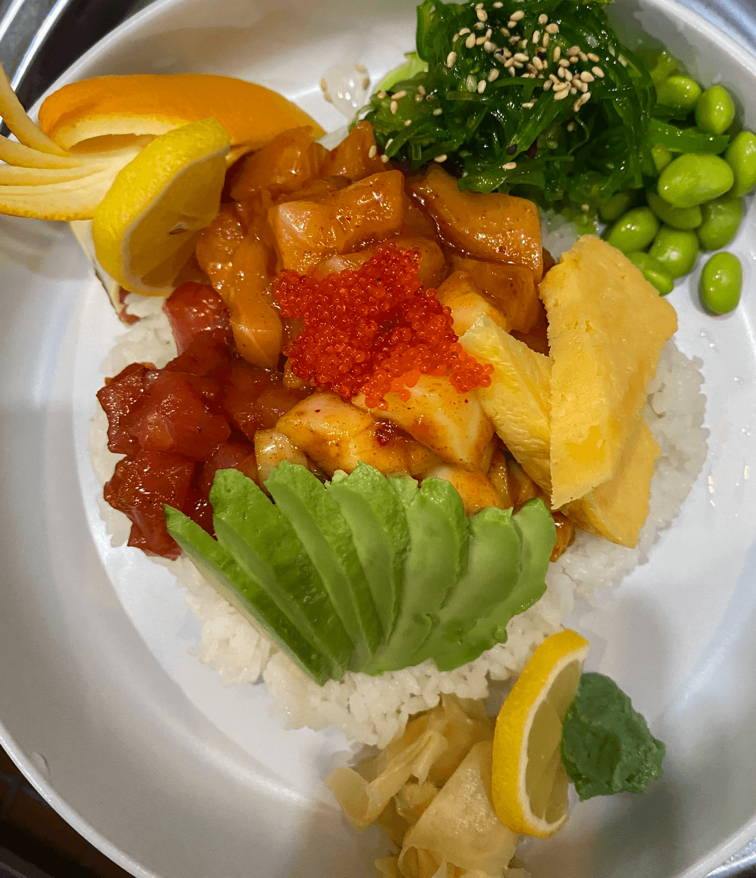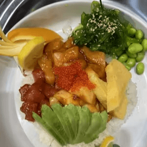 Served raw. Tuna, salmon, white fish, avocado, cucumber, edamame, seaweed salad, spicy house sauce, topped with sushi rice. Served with miso soup or ginger salad. Available Monday to Saturday from 11:00 AM to 3:00 PM.