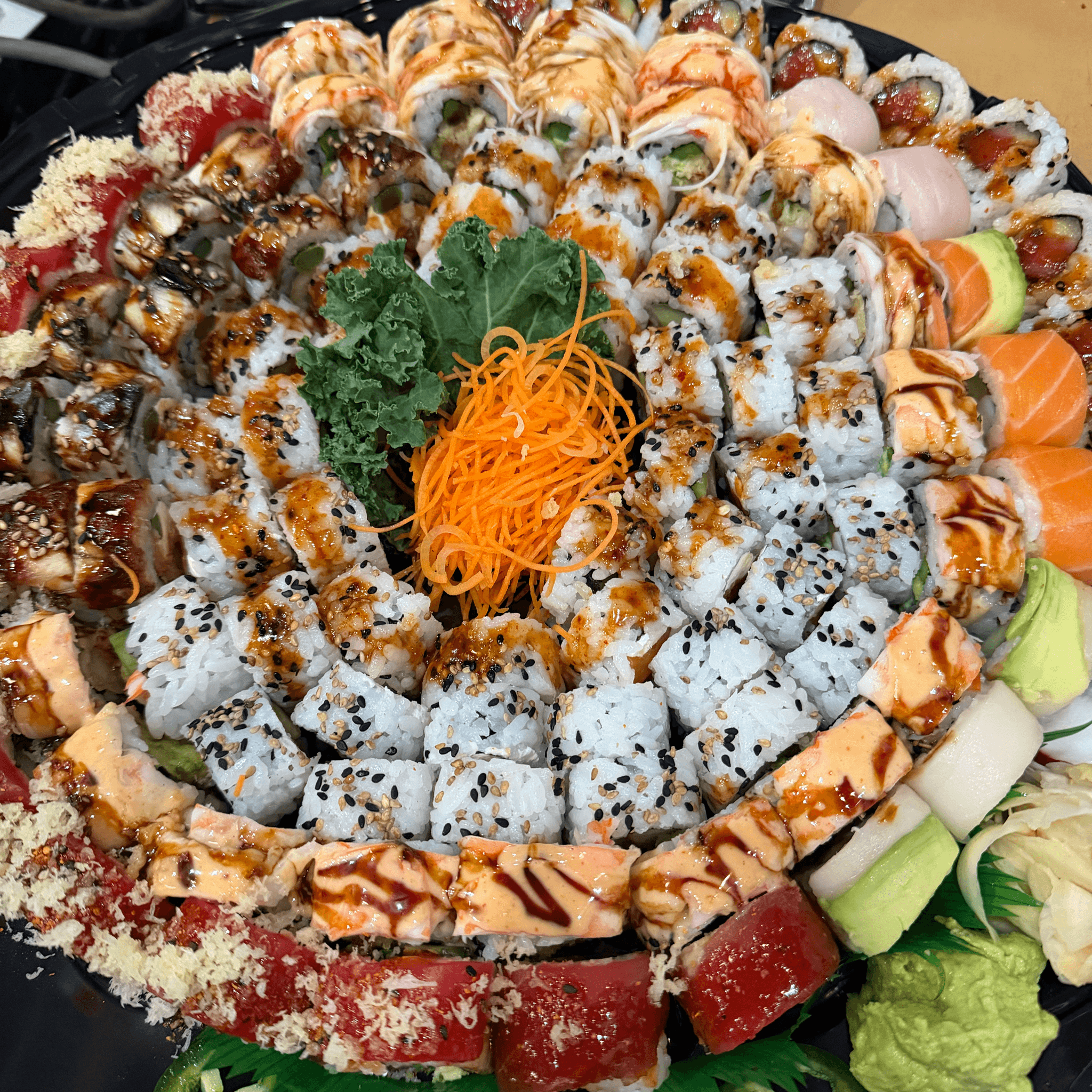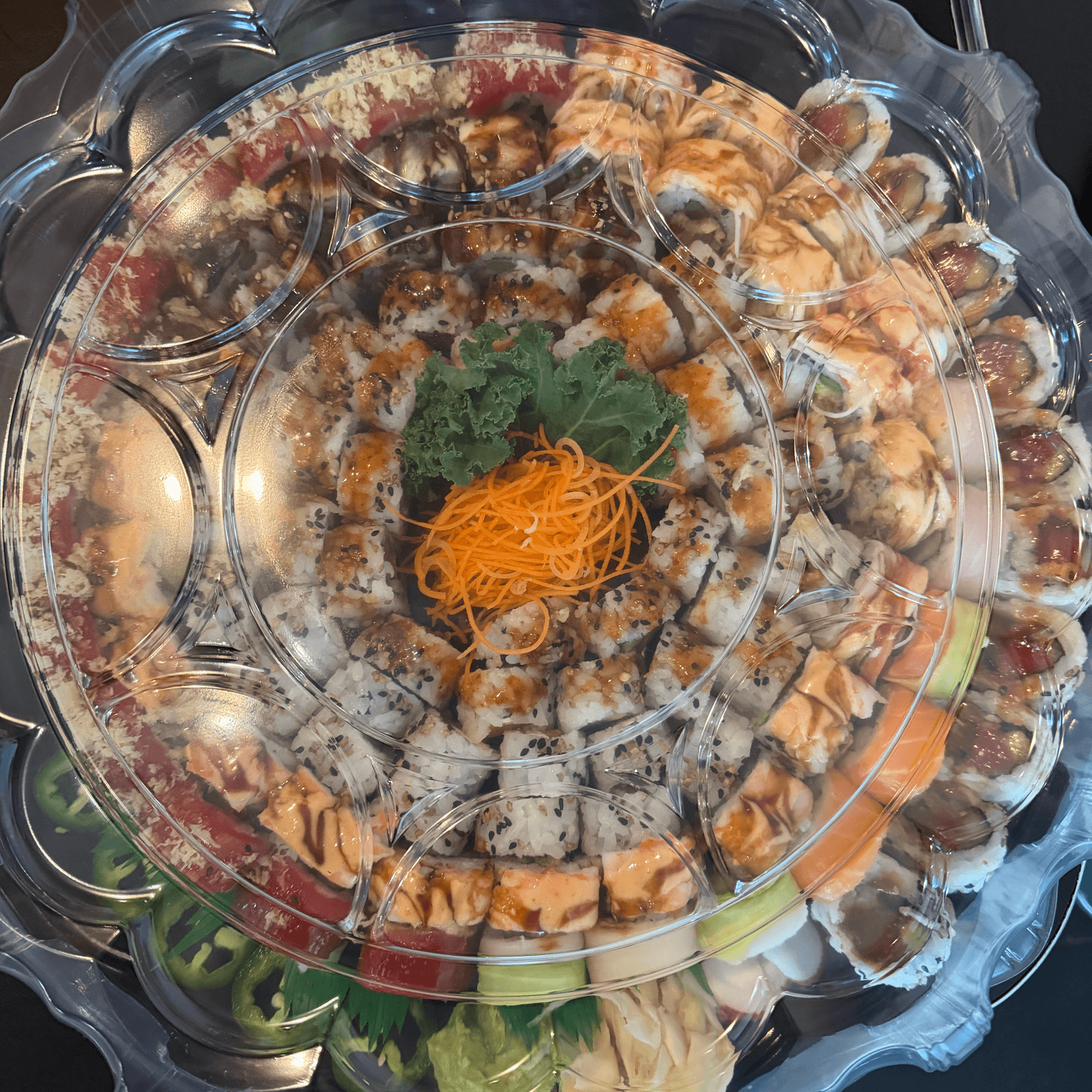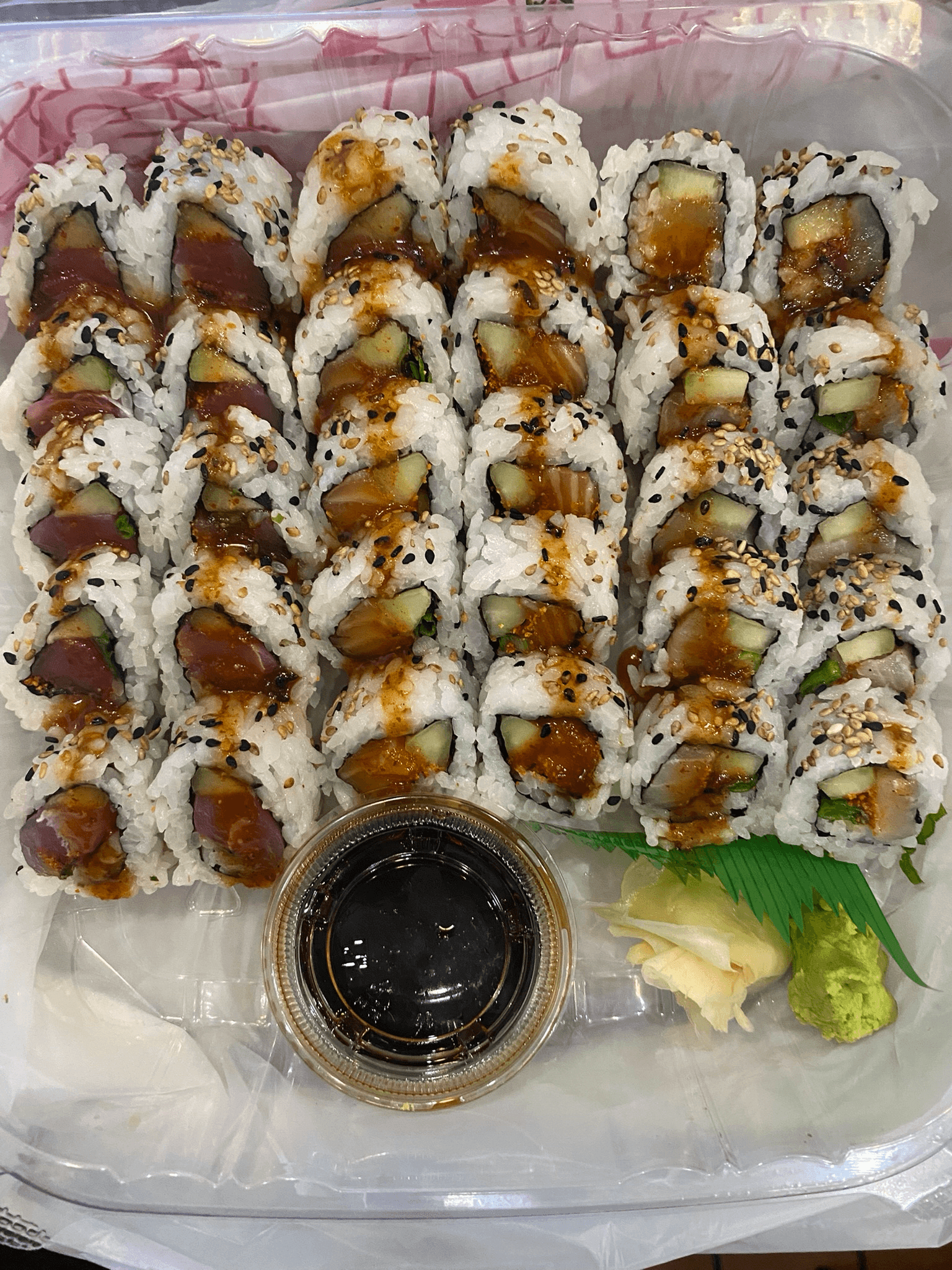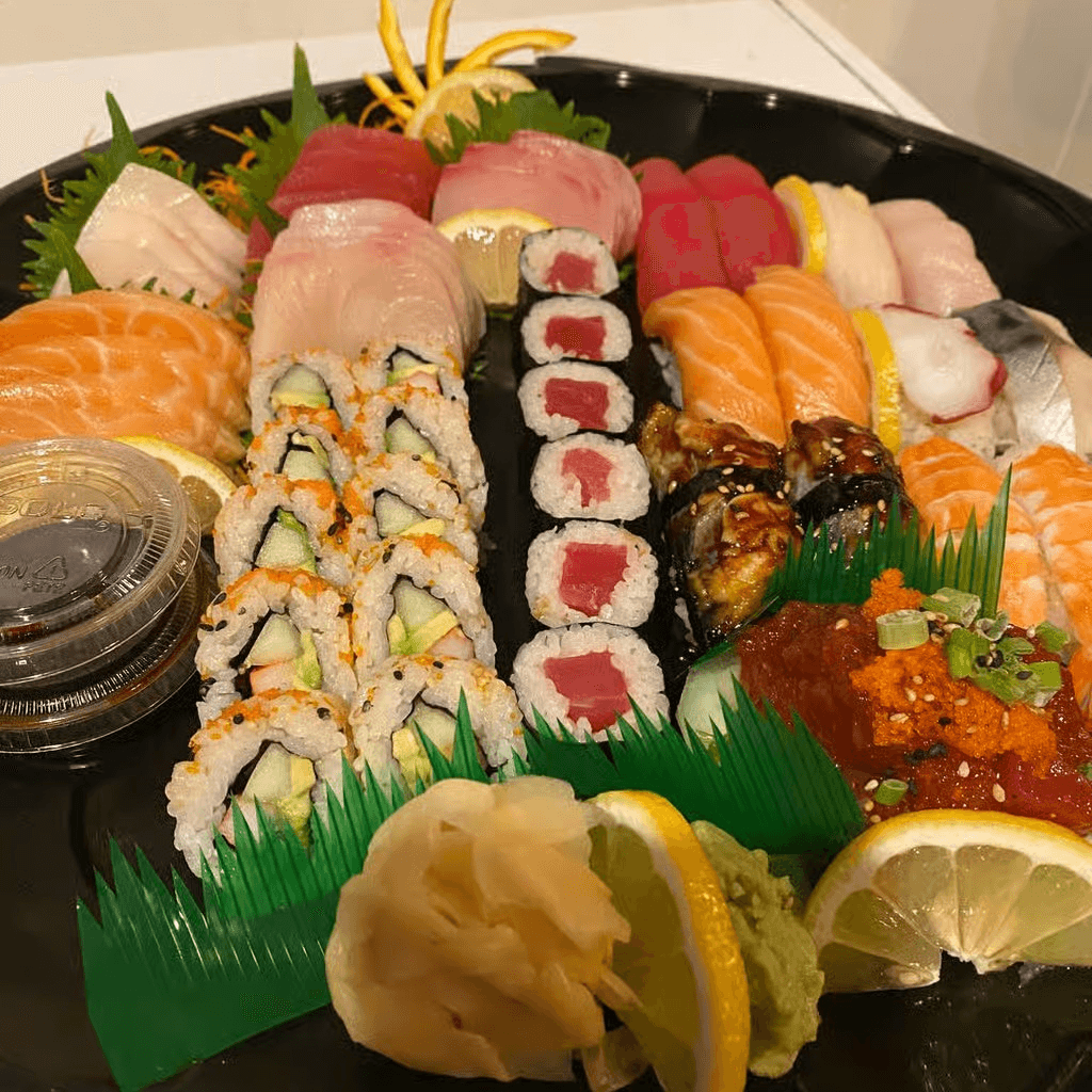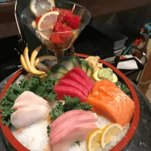 10 pieces of sushi, 15 pieces of sashimi, California roll, spicy tuna roll and mixed spicy tuna salad in a cocktail. Spicy /served raw. Served with clear soup, miso soup, or ginger salad