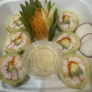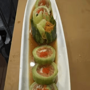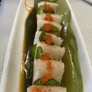 Salmon, krab stick, avocado, and tobiko wrapped in thin cucumber with ponzu sauce