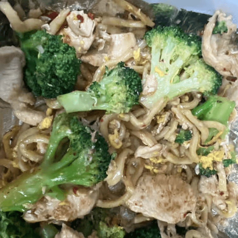 Egg noodle stir-fry with broccoli & a light brown sauce. Available Monday to Saturday from 11:00 AM to 3:00 PM.