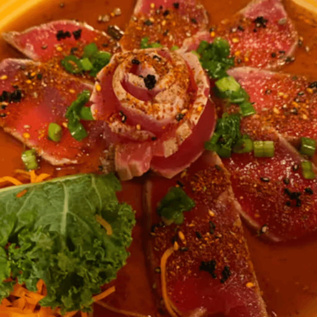 Served raw. Sliced thin seared tuna topped with green spring mix, cucumber with ponzu sauce, and scallions