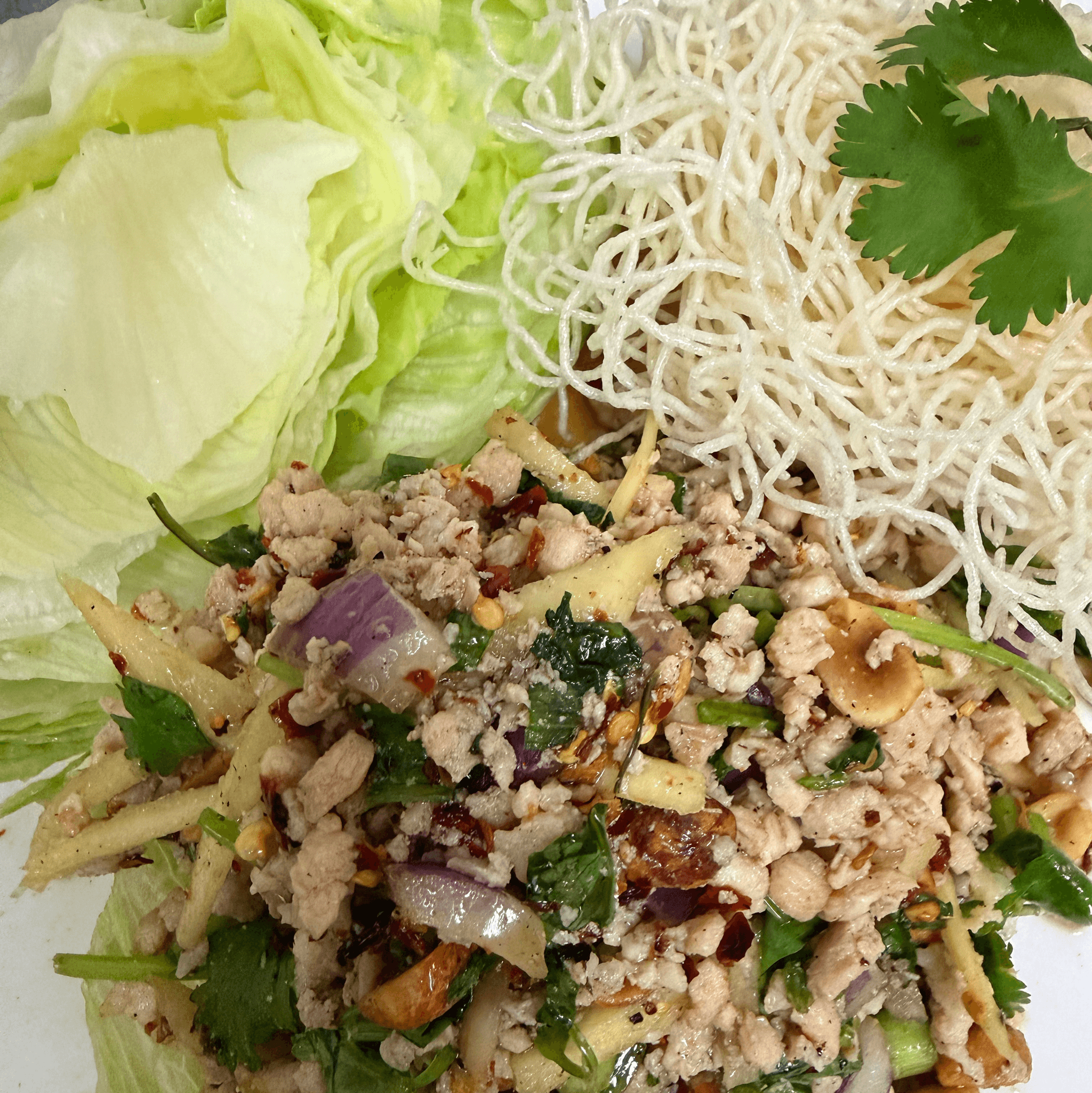 Sautéed ground chicken, scallion, cilantro, ginger served with fresh lettuce, crispy noodles & homemade sauce