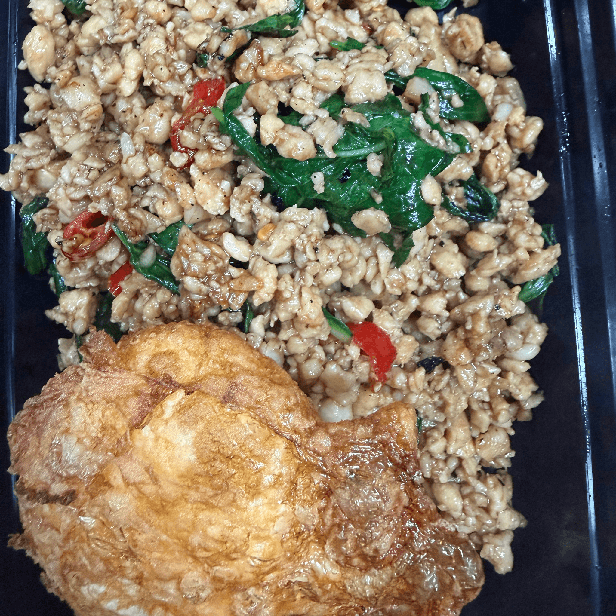 Minced chicken or pork stir-fried with fresh garlic, Thai chili, basil, and a fried egg on top. Served with miso soup or ginger salad and jasmine rice