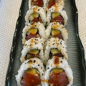 Served raw. Spicy tuna, cucumber, avocado, cilantro, jalapeno, topped with tuna, spicy house sauce and tempura flakes. 🔥 Spicy / 🐟 Served raw