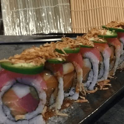 Served raw. Tuna, salmon, white fish, on top of a California roll. 🐟 Served raw