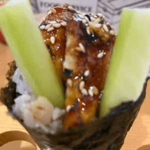 BBQ eel, with cucumber topped with eel sauce and sesame seeds