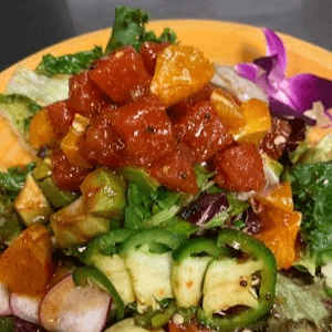 Served raw. Tuna chunk, green spring mix, tomatoes, jalapeno, avocado mixed with spicy house sauce