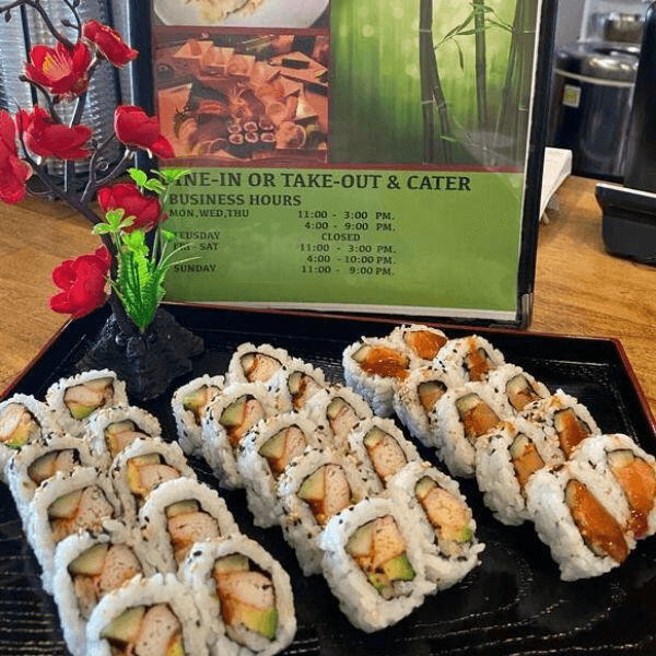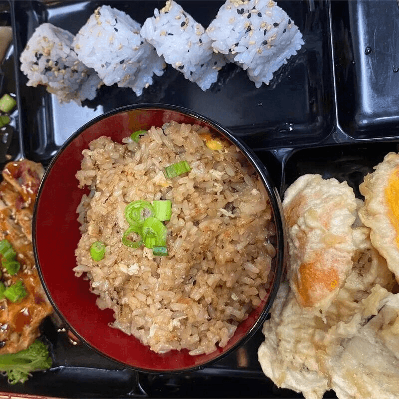 Chicken teriyaki, 4 pieces California roll, plain fried rice, 2 gyoza, and veggie tempura. Available Monday to Saturday from 11:00 AM to 3:00 PM.