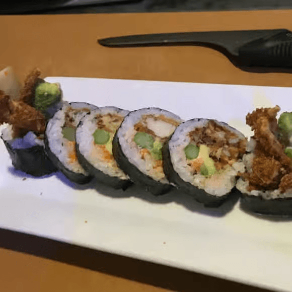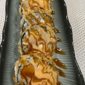 Shrimp tempura, asparagus, cream cheese and avocado topped with spicy mayo & eel sauce. 🔥 Spicy